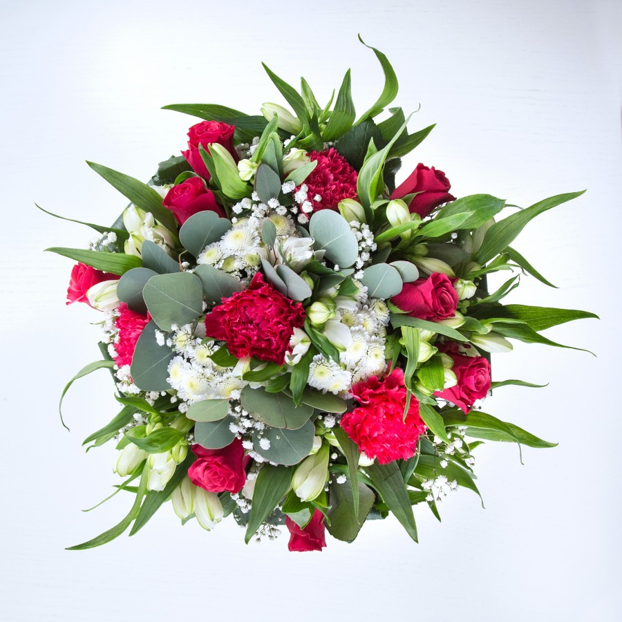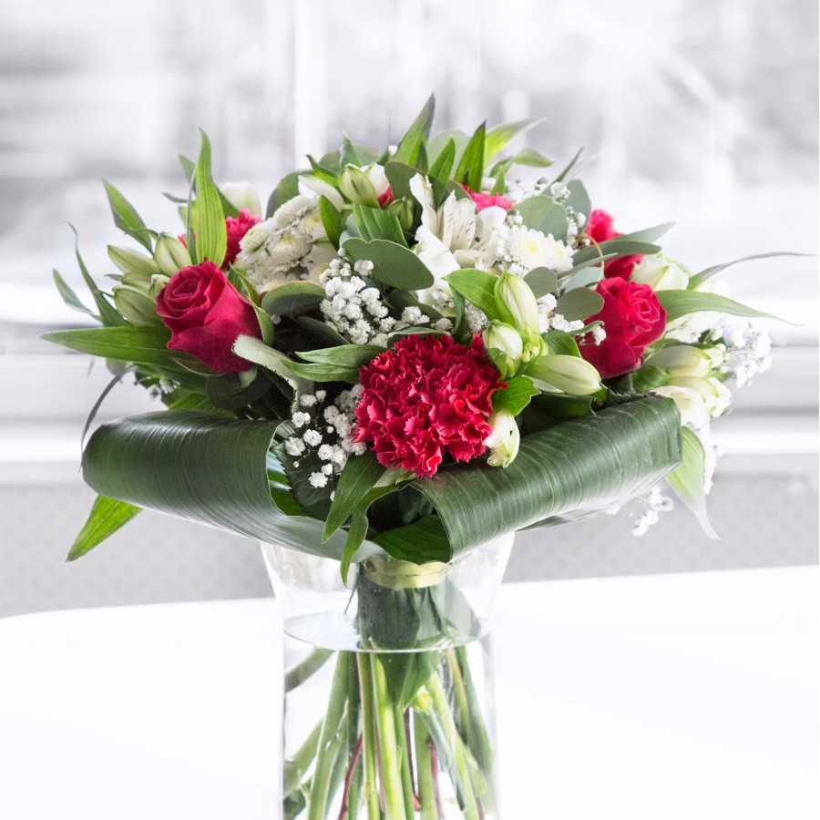 Immerse yourself in the captivating beauty of our unique bouquet, a perfect blend of vibrant colors and exquisite flowers. Each arrangement features sweet white chrysanthemums, delicate gypsophila, luxurious red roses, and charming carnations, thoughtfully combined with pristine white alstroemeria and lush aspidistra leaves.