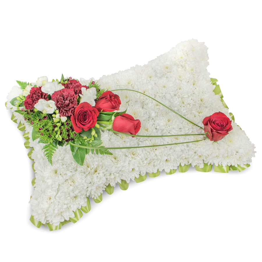 Show your support with our elegant sympathy bouquet, meticulously arranged with white chrysanthemums, red roses, white freesias, and dark red carnations, enhanced by dianthus and bear grass for a graceful touch.